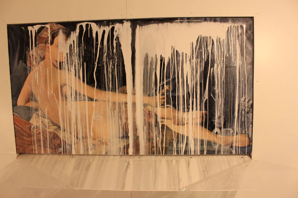 After spending 80 hours painting a very precise copy of Ingre's Odalisque, I encouraged participants to give the nameless female model for this famous painting back her agency. Participants were encouraged to squeeze sculptural latex breasts; when they did so, white paint slowly streamed through the front of the painting. The whole piece was only in existence for one evening, after which it was dismantled and destroyed.